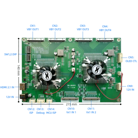 The BH-8KHVV is a driver board that supports panel display resolutions up to 8K@120Hz . It supports operating mode selection via DIP switches to configure various input and output functional requirements.
