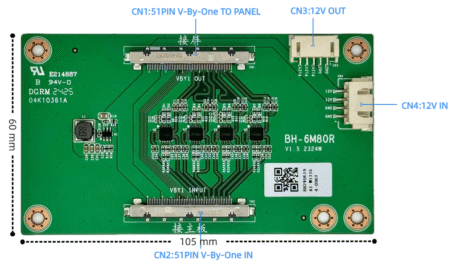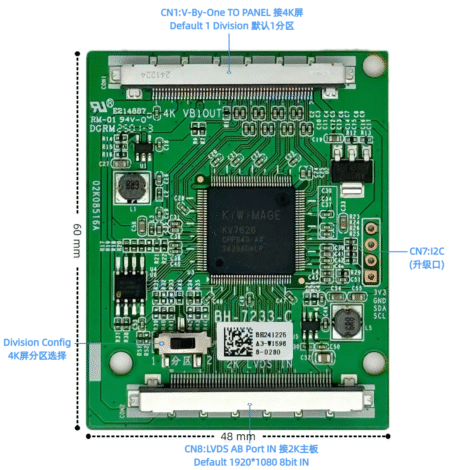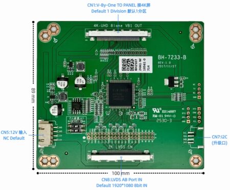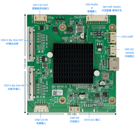 The BH-4KVH-B is a 4K V-By-One to HDMI signal converter board that supports 8 lane V-by-One input, drives 8 lane V-By-One 4K 60Hz large-size panels through V-By-One bridging, and simultaneously outputs HDMI signals.