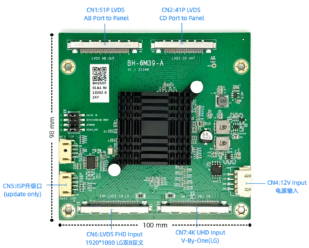 BH-6M39-A is an LVDS signal frequency doubling conversion board (supporting 1920×1080@50/60Hz → 1920×1080@100/120Hz conversion). It provides a Full-HD LVDS input interface, and after image processing such as frame rate conversion, it generates FHD 120Hz four-channel LVDS signals, which can directly drive 2K@120Hz display panels.