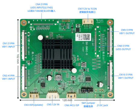 BH-6M60-A is a 4K@60Hz-4K@120Hz signal adapter board (3840*2160@60Hz→3840*2160Hz@120Hz conversion), providing a standard 8-lane V-By-One input interface and directly driving a 4K@120Hz V-by-One signal interface panel. It supports most 4K 120Hz panels on the market and 4K OLED screens.