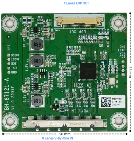 BH-87121-A is an 8-Lane V-By-One to 4-Lane eDP signal conversion board. It supports driving various models of 4-Lane eDP screens, such as BOE's MV270QUM-N10.