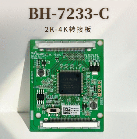 BH-7233-C is a 2K-to-4K signal conversion board (supporting 1920×1080@60Hz → 3840×2160@60Hz conversion). It features a standard Full-HD LVDS input interface (as defined by LG) and processes signals through image enhancement technologies such as Scaler-based upscaling. The board generates 4K ultra-high-definition V-By-One signals, which can directly drive 4K@60Hz display panels. For output, it supports 1-zone and 2-zone 4K V-By-One signal formats.