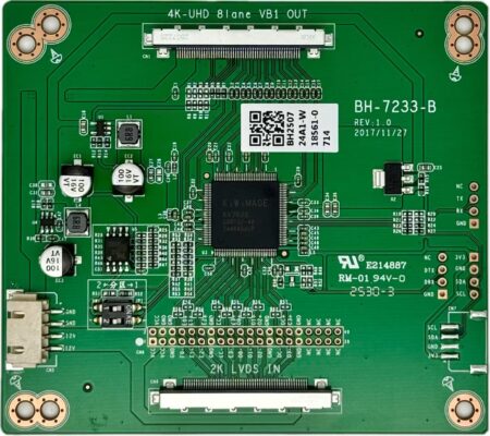 BH-7233-B is a 2K-to-4K signal conversion board (supporting 1920×1080@60Hz → 3840×2160@60Hz conversion). It features a standard Full-HD LVDS input interface (as defined by LG) and processes signals through image enhancement technologies such as Scaler-based upscaling. The board generates 4K ultra-high-definition V-By-One signals, which can directly drive 4K@60Hz display panels. For output, it supports 1-zone and 2-zone 4K V-By-One signal formats.