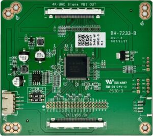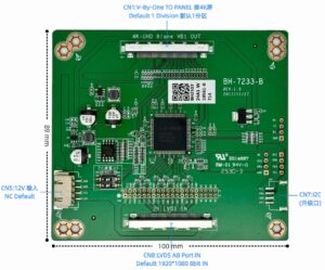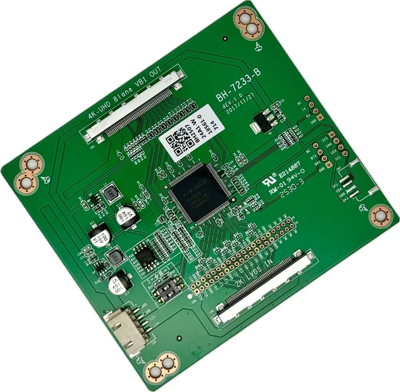 BH-7233-B is a 2K-to-4K signal conversion board (supporting 1920×1080@60Hz → 3840×2160@60Hz conversion). It features a standard Full-HD LVDS input interface (as defined by LG) and processes signals through image enhancement technologies such as Scaler-based upscaling. The board generates 4K ultra-high-definition V-By-One signals, which can directly drive 4K@60Hz display panels. For output, it supports 1-zone and 2-zone 4K V-By-One signal formats.