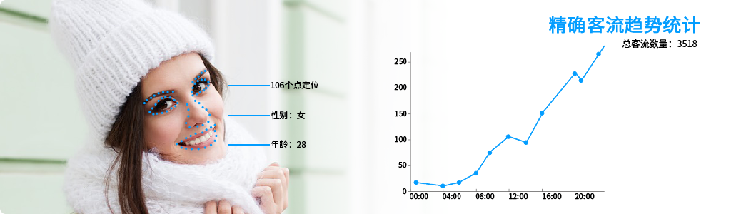 Real-time customer flow statistics: Counts daily and hourly real-time customer flow information, extracts facial features, and avoids double counting.