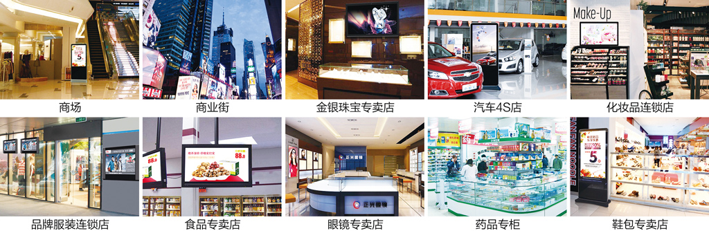 Shopping malls, commercial streets, jewelry stores, auto dealerships, cosmetics chains, branded clothing chains, food stores, eyewear stores, pharmacies, shoe and bag stores, and other public venues where people gather.